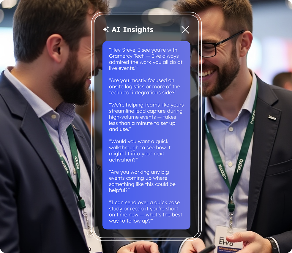 GXP Connect makes capturing leads at live events effortless. Simply point your device at any attendee badge to instantly capture contact details, with no QR codes or integrations required. Built-in AI then analyzes each lead in real time, providing insights and talking points that help your team connect faster, pitch smarter, and maximize event ROI.